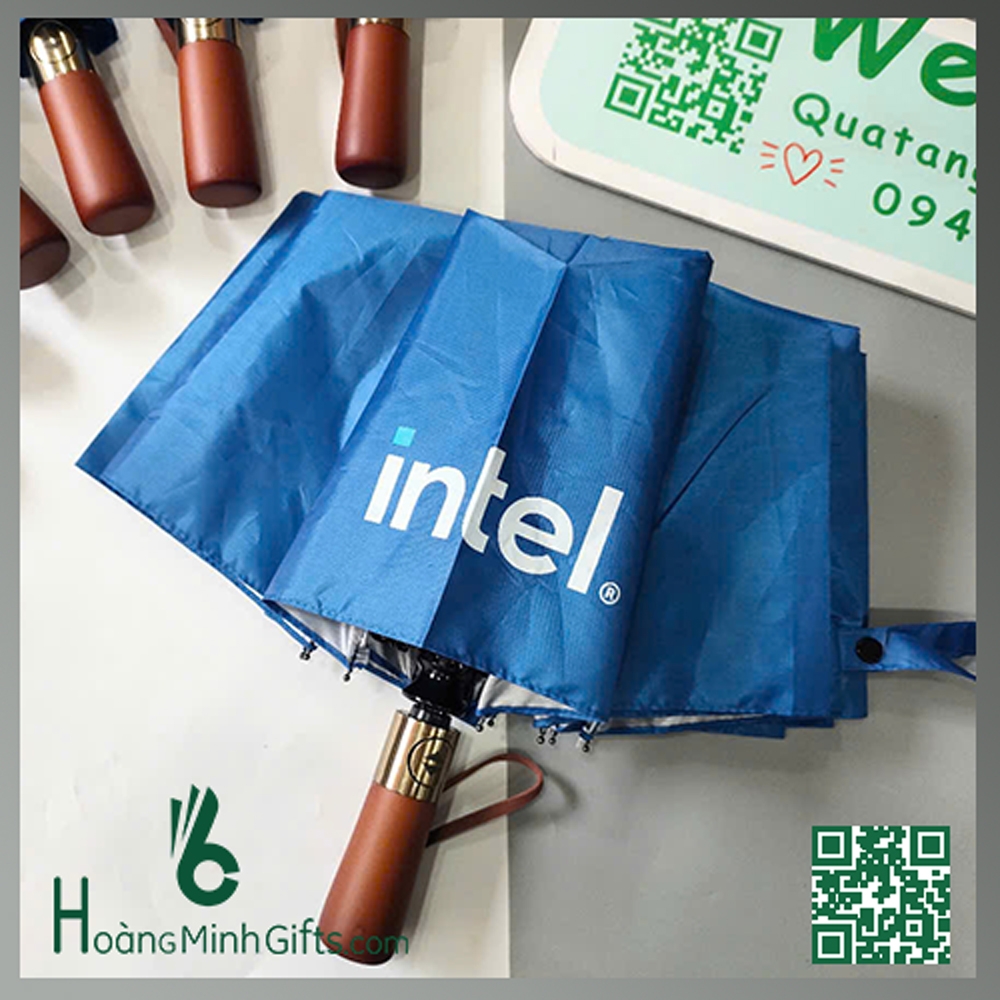 - Ô gấp 3 tự động 1 chiều, 8 cánh, thân và xương bằng kim loại, sơn tĩnh điện đen, chống rỉ, cán gỗ, in logo lên cánh theo yêu cầu.